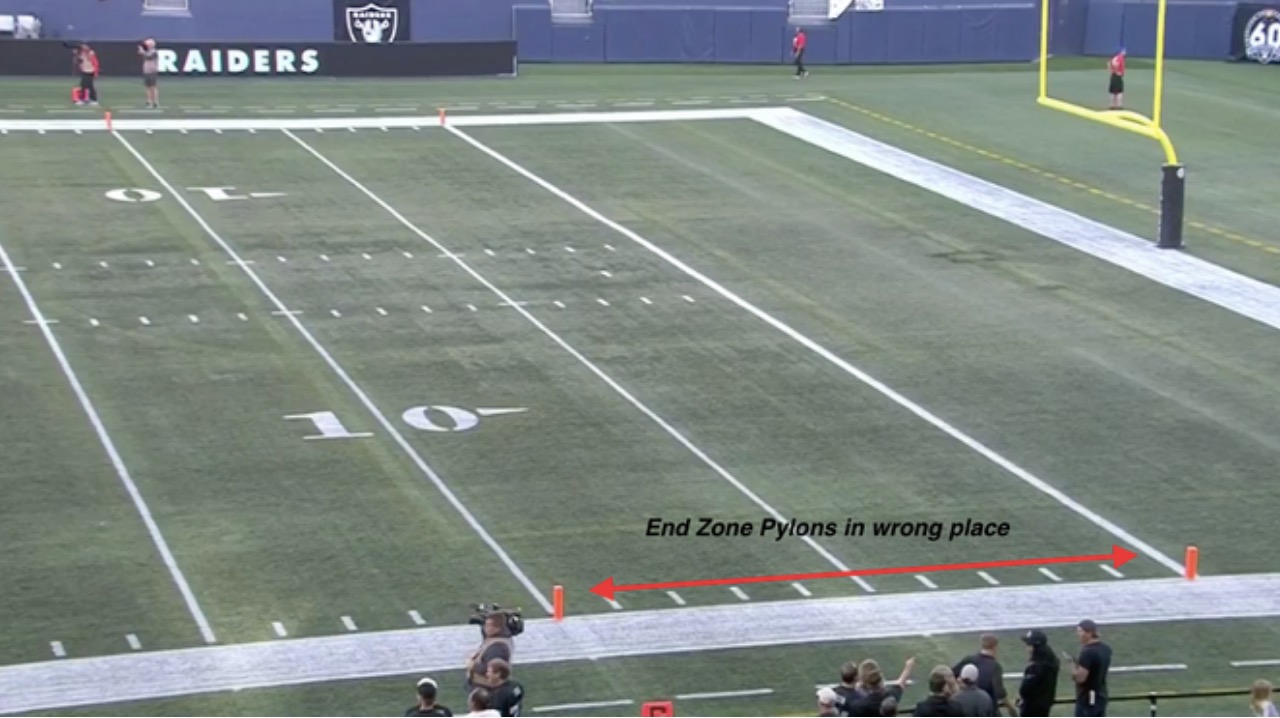 Since this all probably sounds mildly confusing, here’s a look at the field. As you can see below, the pylon for the goal line is at the 10-yard line while the pylon that marks the back of the end zone is at the old goal line.