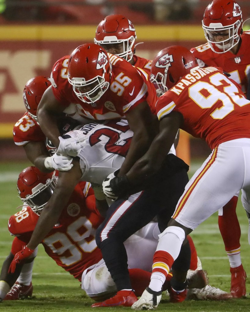 The Super Bowl MVP threw for 211 yards and three touchdowns, Clyde Edwards-Helaire ran through the rain for 138 yards and another score, and the Chiefs began defense of their first championship in 50 years by beating the Houston Texans 34-20 before a socially distanced crowd of about 17,000 due to the coronavirus pandemic.