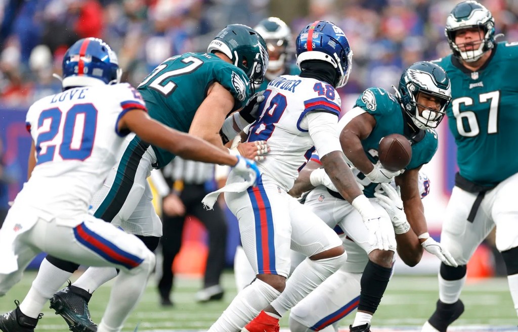 The Giants intercepted Philadelphia quarterback Jalen Hurts three times. Dexter Lawrence forced a fumble from Giant-killing Philadelphia running back Boston Scott and Julian Love recovered at the Giants’ 37-yard line with 1:34 to play. That seemingly ended the game, but a quick three-and-out by the Giants gave Philadelphia another chance.