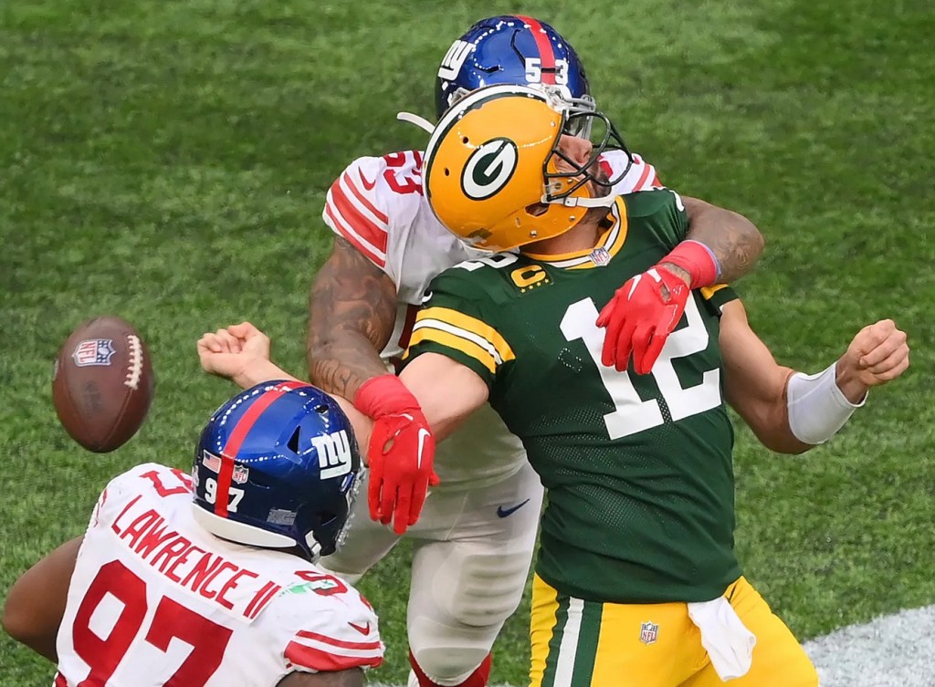 Barkley scored the game-winning touchdown with 6:08 remaining and then turned the game over to their largely no-name defense. Rodgers moved the Packers to the Giants’ 7 yard line but on fourth down his pass was deflected up and into the air by blitzing safety Xavier McKinney. The ball fell harmlessly to the grass at Tottenham Hotspur Stadium with 1:11 remaining and soon after the Giants secured an improbable 27-22 comeback victory.