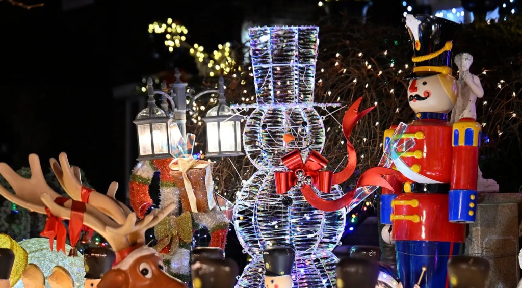 Subtlety is sidelined. From lawns to rooftops, every inch of property is covered with illuminated choirboys, angels, wreaths and snowflakes.