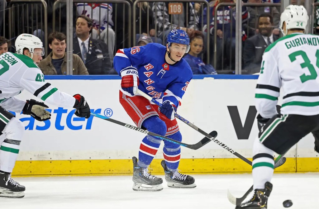 K’Andre Miller’s snap shot from the top of the circle beat Stars goalie Jake Oettinger with just 0.9 seconds left in regulation to send the Rangers to overtime. Just 1:16 of game time later, in the 3-on-3 extra session, Adam Fox deftly potted a backhander past Oettinger amid chaos in front of the Dallas goal, sealing a stunning 2-1 victory for the Blueshirts at The Garden on Thursday night.
