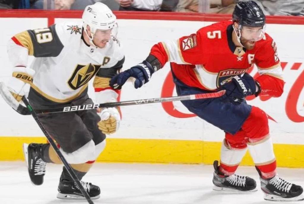 Zach Whitecloud and Mark Stone scored less than seven minutes apart in the third period, Hill made 33 saves that included a highlight-reel stick save with the game tied early in the second period, and the Golden Knights defeated the Florida Panthers 5-2 in Game 1 of the Stanley Cup Final at T-Mobile Arena on Saturday.