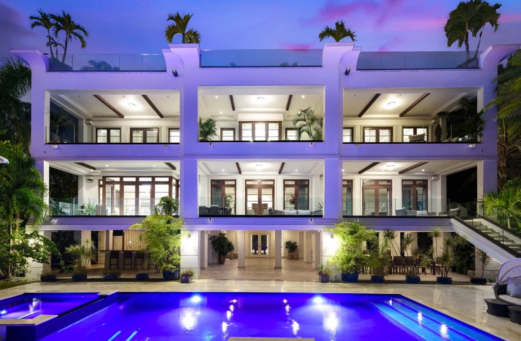 The 0.32-acre Palm Island lot faces Miami across the Biscayne Bay. It has a private dock, a pool, a hot tub, a stone deck, huge terraces and parking for 10 cars.