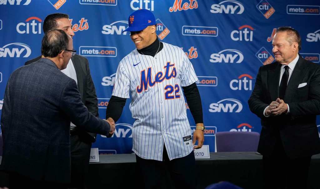 Juan Soto was introduced at Citi Field after his record $765 million, 15-year contract was finalized. He was flanked by Mets owner Steve Cohen, president of baseball operations David Stearns and agent Scott Boras.