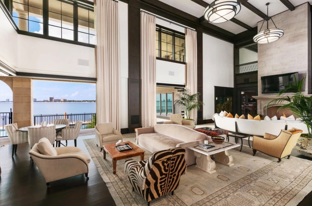 It is a 30,875-square-foot estate that was built in 2012 and sits on 1.25 acres. It has seven bedrooms, eight full bathrooms, eight half-baths, and almost 9,000 square feet of outdoor space that includes two boat lifts and an 80-foot-long pool.